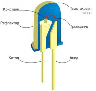 Светодиод - это полупроводниковый прибор, предназначение которого преобразовывать электрический ток в световое излучение, т.е. электромагнитное излучение видимой части спектра. Устройство светодиода показано на рисунке. Он состоит из полупроводникового кристалла, корпуса с контактными выводами и оптической системы. Это устройство простейшего светодиода.