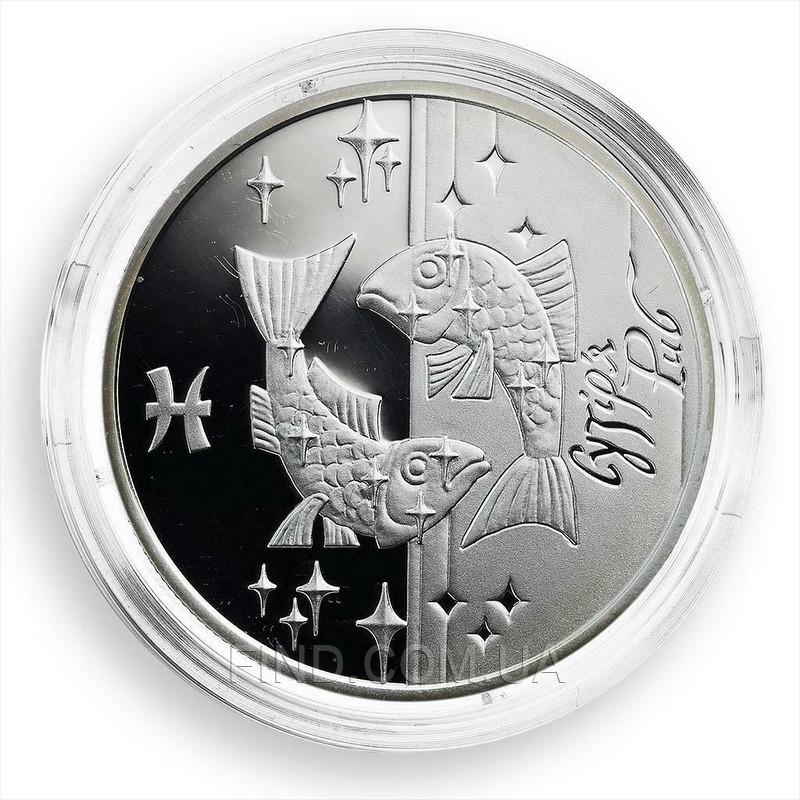 - На реверсе серебряной монеты размещено стилизованное изображение знака зодиака в окружении звезд, слева от которого - символ знака зодиака, справа - надпись 'Рыбы' .