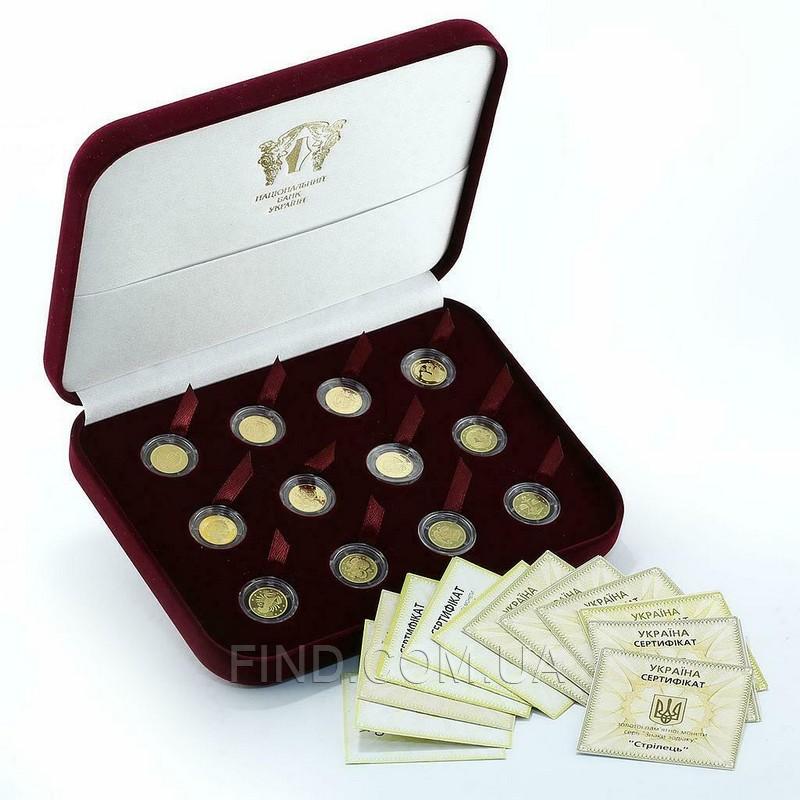 Сувенирный набор из подарочных золотых монет знаков зодиака (12 штук) изготовленных из золота 999,9 пробы. На каждую золотую монету предоставляется сертификат НБУ.
