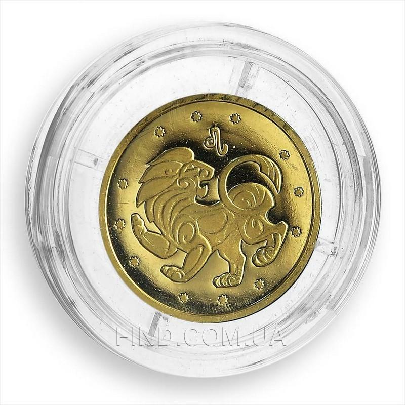 - На реверсе золотой монеты размещено стилизованное изображение знака зодиака 'Лев' в окружении звезд, над которым - символ знака зодиака.