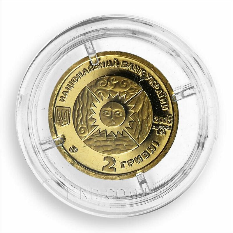 - В центре круга - стилизованное изображение солнца. Слева от круга - малый Государственный Герб Украины, справа - год чеканки монеты, обозначение металла, его пробы - Au 999,9, масса - 1,24;