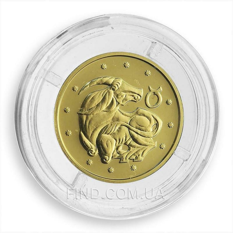 - На реверсе золотой монеты размещено стилизованное изображение знака зодиака 'Телец' в окружении звезд, над которым - символ знака зодиака.